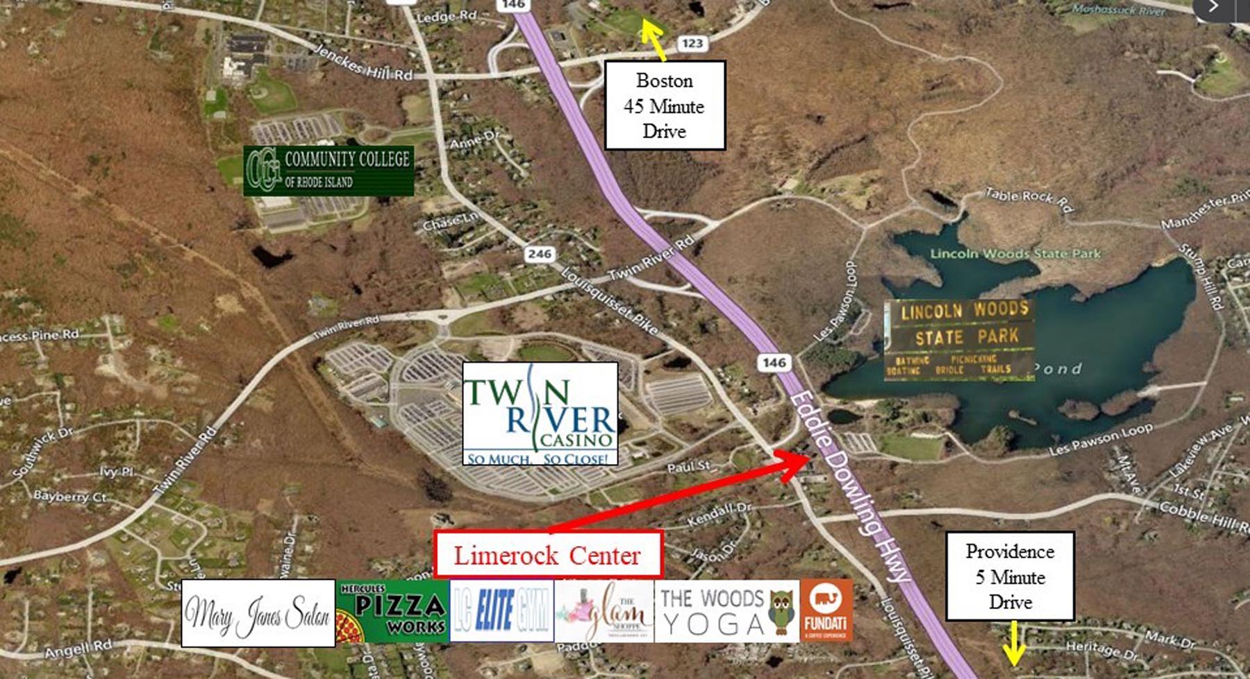 This mixed use center is ideally located directly off of Rte. 146 in Lincoln Rhode Island. Limerock Center offers retail and office space with convenient access to and from I-95 and I-295 and only 5 minutes from Providence.